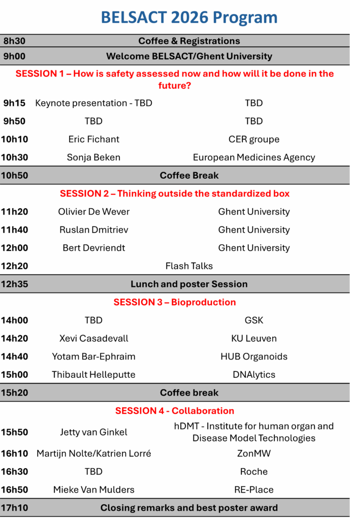 | Leading scientists in these fields will discuss major innovative tools which support animal cell culture and processes understanding, control and improvement. – Want to learn more about the BELSACT association and be part of this scientific adventure? – Want to share your vision on how to create opportunities to promote collaboration between industries and universities and create a strong local network of people and institutions? – Want to meet other ACT scientists? – Want to share innovative science? Join us on 3rd April 2026 at in Ghent! If you just want to meet other ACT scientists.If you want to share and see innovative science. Join our MOTIVATED core team to attend full scientific day. |